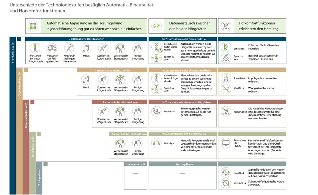 Einen Überblick der verschiedenen Funktionen der Phonak Hörgeräte finden Sie auch in dieser Grafik.